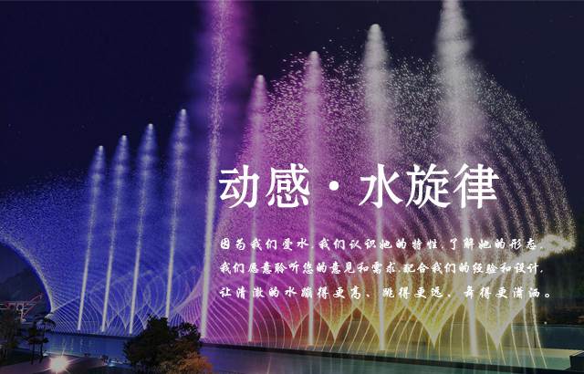 云南龍諾噴泉 — 專(zhuān)業(yè)打造融入地方特色的創(chuàng)意水景噴泉設(shè)計(jì)工程,主要從事園林景觀工程、大型水秀水景工程、昆明音樂(lè)噴泉工程、程控噴泉工程、冷霧造景、水幕電影、數(shù)碼水簾、環(huán)保工程、燈光亮化工程的設(shè)計(jì)與施工。始終堅(jiān)持質(zhì)量為先的工程理念,提供全方位的服務(wù)支撐,堅(jiān)持做充滿藝術(shù)觀感的高品質(zhì)噴泉水景。